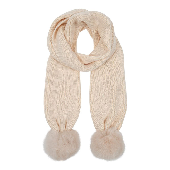 Funda er et vidunderligt halstørklæde, strikket af uld og akryl, så det er fleksibelt og varmt. Halstørklædet har en stor pom pom af rævepels i begge ender.