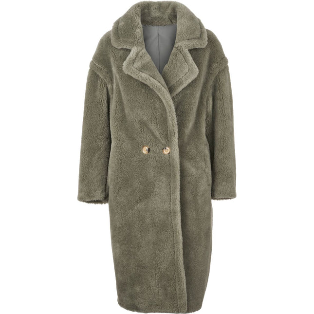 Denne lange frakke er lavet af New Zealandsk Lammeskind og har et rustikt, men blødt look. Pelsen er klippet kort, hvorved pelsens kvalitet er meget synlig og kan mærkes i de korte krøller, der kommer frem, når pelsen klippes. Den korte længde på pelsen er også meget modstandsdygtig over for snavs, fordi der ikke er meget pels at komme ind i. Frakken har to knapper i midten og to store lommer foran. Frakken er foret på indersiden og har en smuk bred krave.