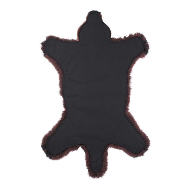 Dette er et gulvtæppe af ægte lammeskind, der forestiller en brun bjørn. Lammeskindet, som bjørnen er syet sammen af, er fra New Zealand og har en chokoladebrun farve med sorte markeringer ved snude og poter.Tæppet er medicinsk garvet, og det betyder, at det er lavet specifikt til små børn og deres sarte hud. Her kan du læse om, hvordan børn kan få glæde af ægte pels.