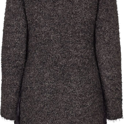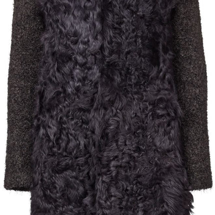 Joy er en jakke, der primært består af strikket uld, mens forsiden har tværgående striber med krøllet lammeskindspels.